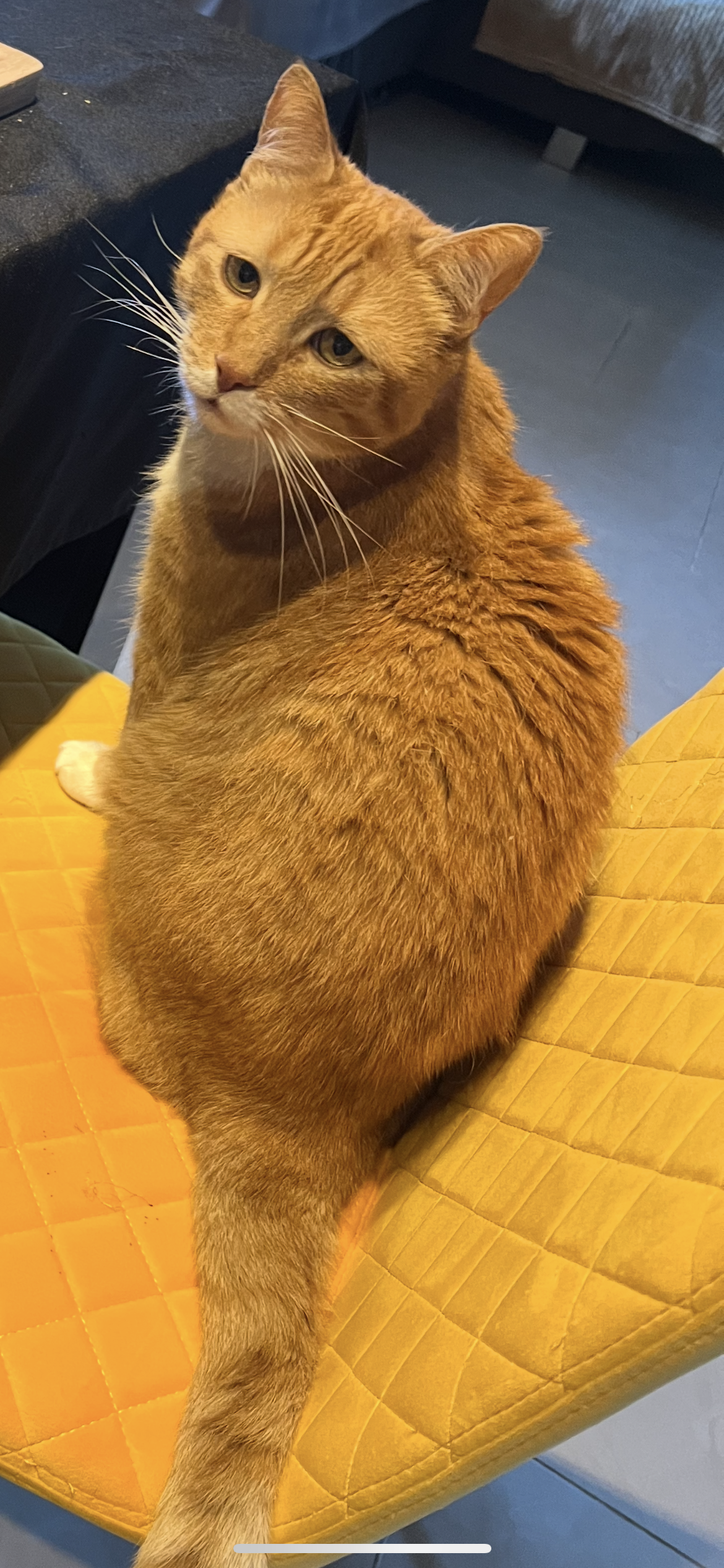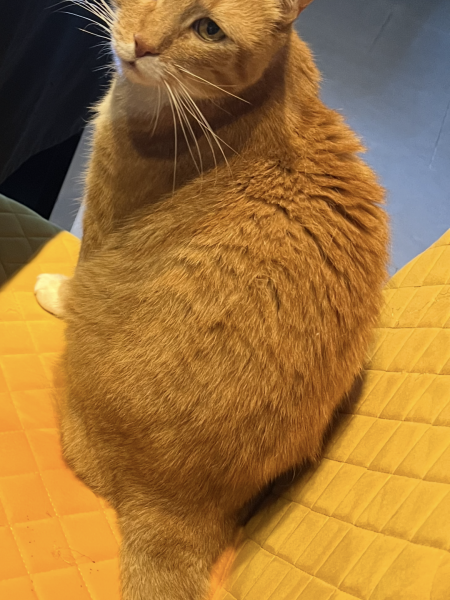 - Signe particulier : Chat roux avec une tache blanche sous le cou, a toujours une tête de malheureux