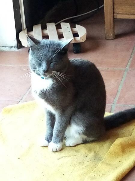 - Commentaire : Petit chat gris aux yeux verts, naturellement avenant et ronronnant beaucoup.