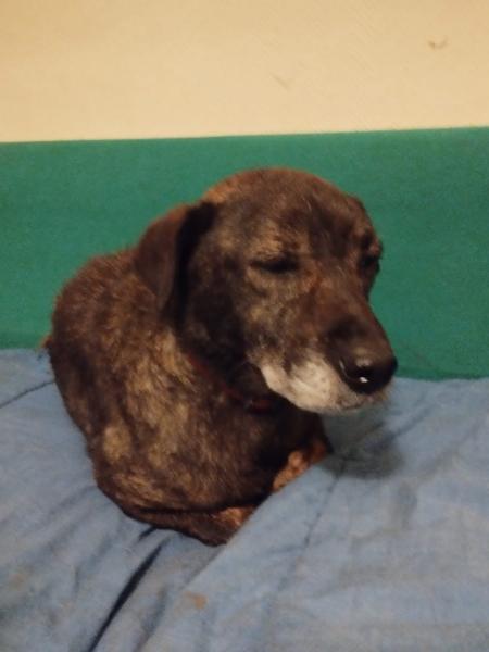 - Signe particulier : Il a son harnais jaune et sa laisse brune/rose. Son museau est tout grisonnant. Il fait 35cm au garrot et 10kg
