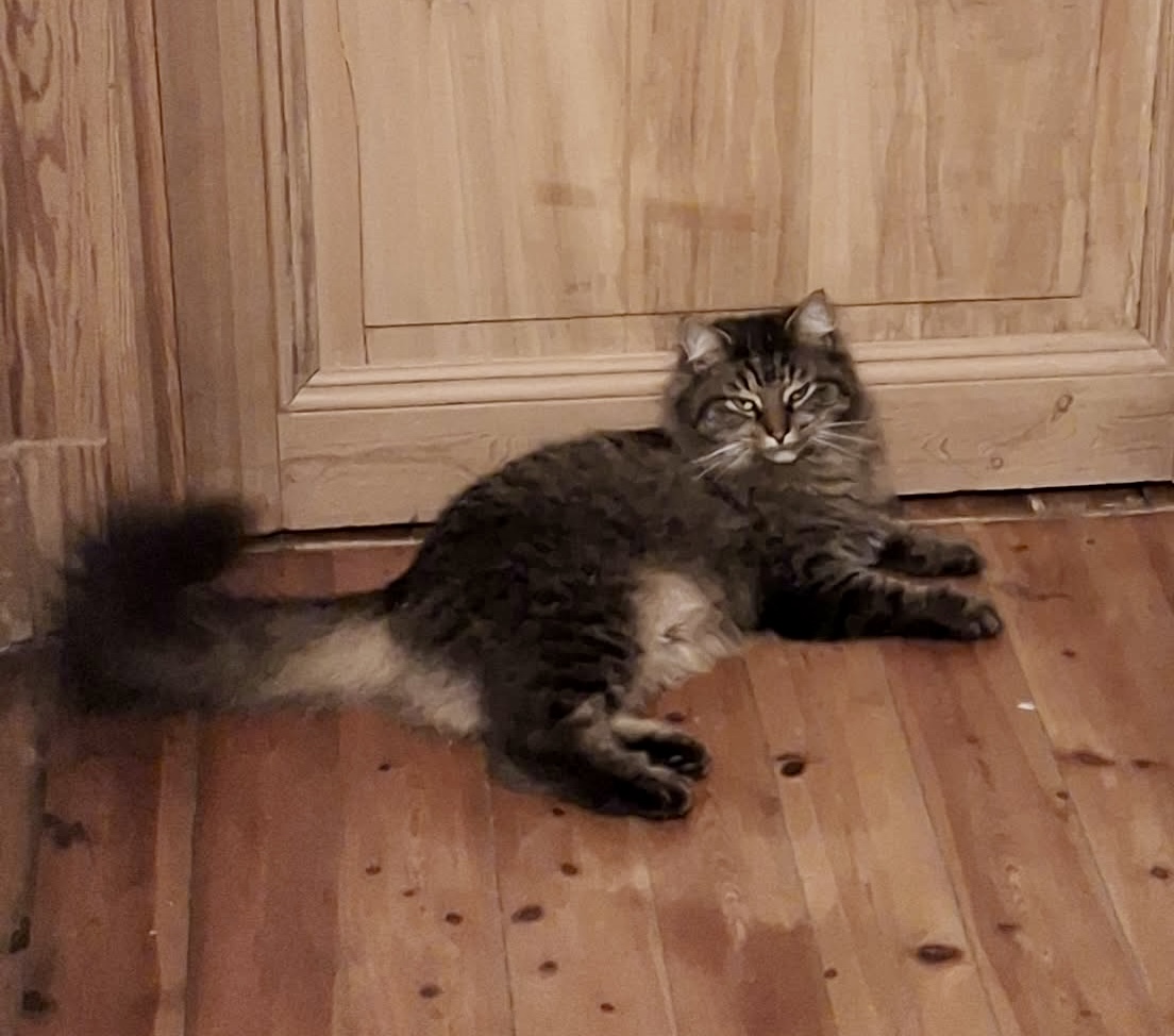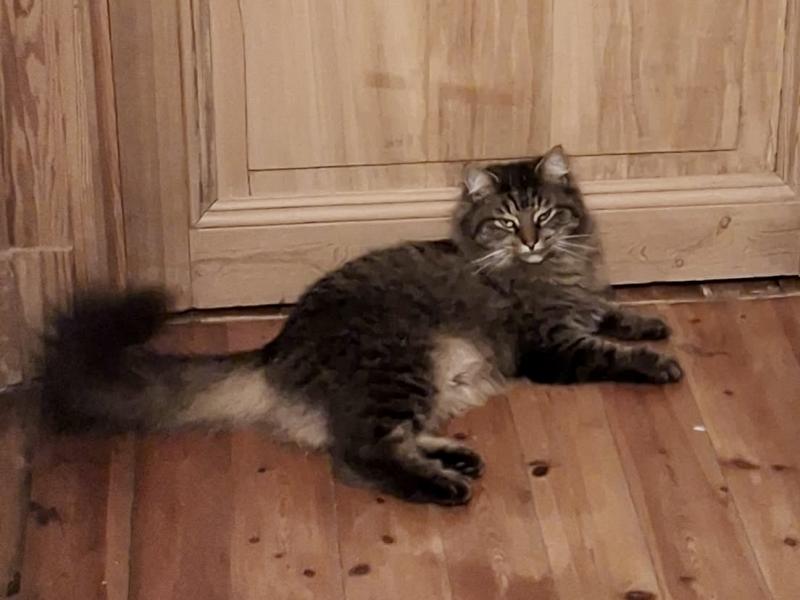 - Signe particulier : Poils longs, tigré foncé sur le dos, yeux verts clairs. grosse queue très touffue