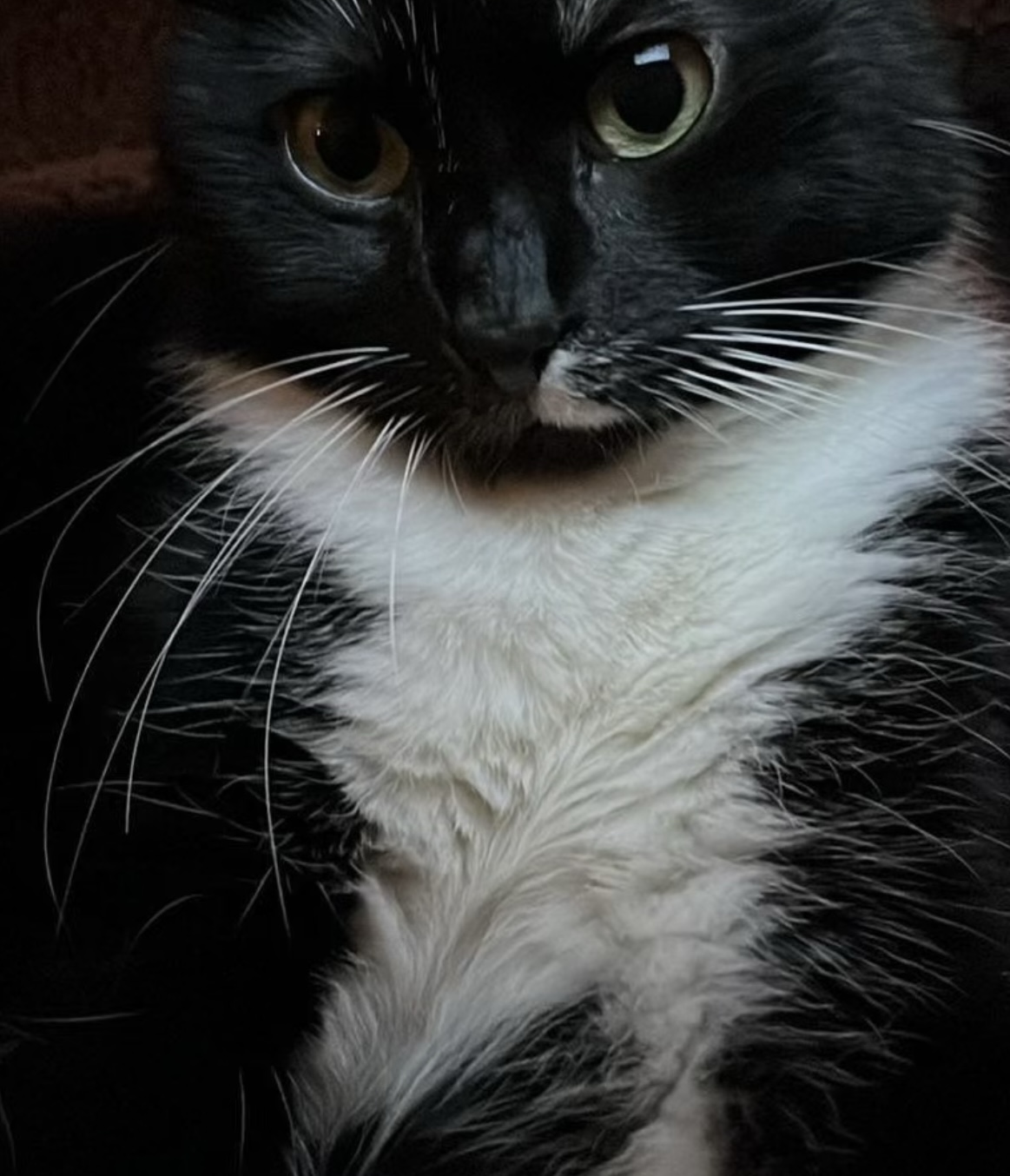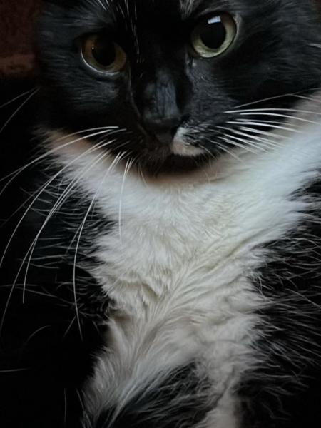 - Commentaire : C’est un chat noir et blanc opéré. Très craintive! Elle a une petite lune sur le museau. Elle est opérée et pucée