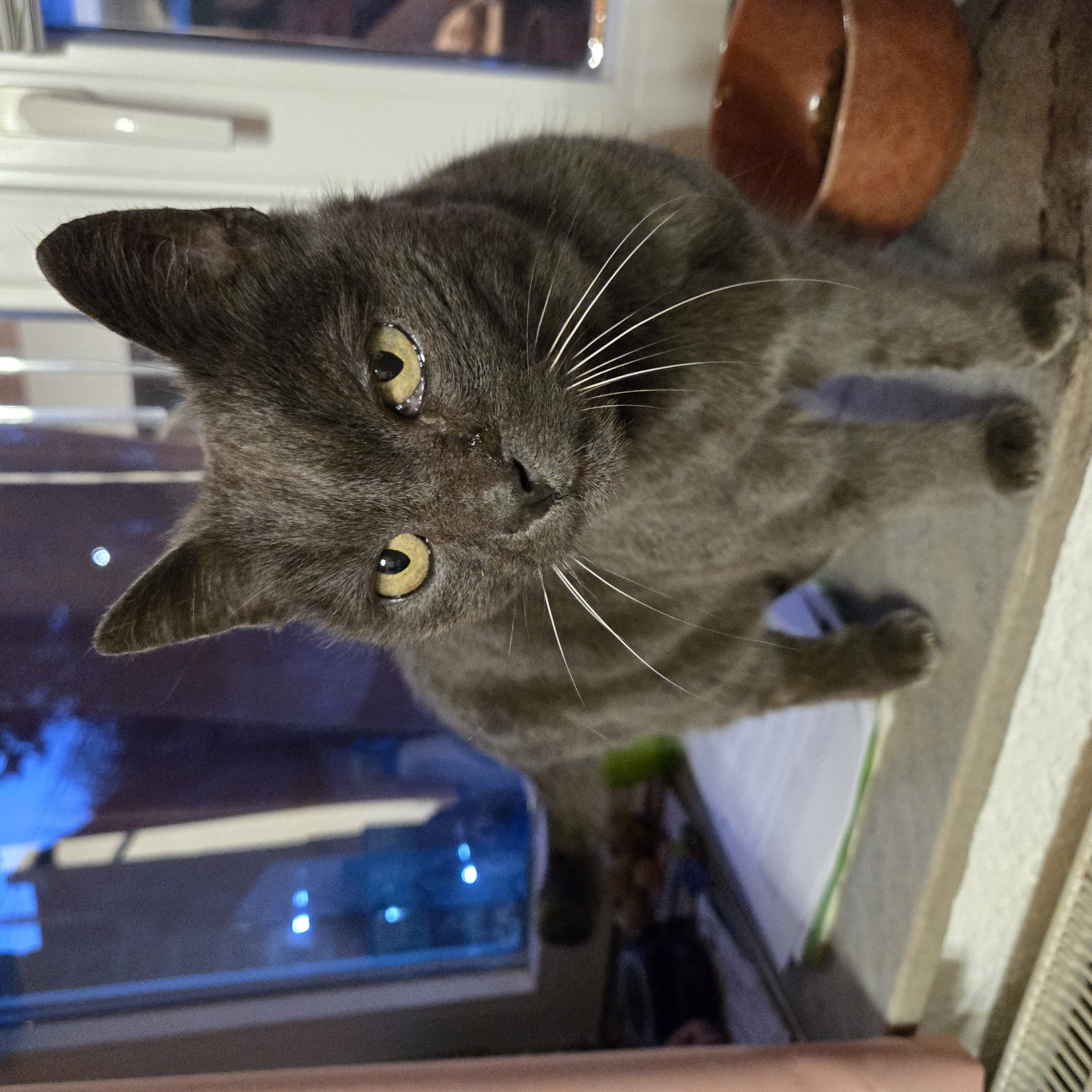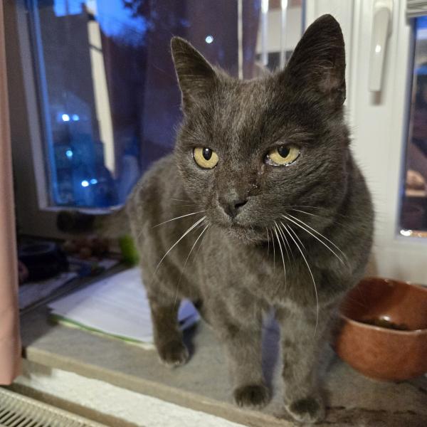 - Commentaire : Chatte présente près de chez nous depuis environ deux semaines. Elle restait dehors et venait manger les restes que nous lui donnions, puis elle a fini par entrer chez nous. Nous l’avons mise à l’abri dans notre cave. Elle est maigre, douce et sociable, ronronne fort et cherche le contact. Elle a un œil blessé / abîmé et sa respiration semble encombrée, elle passe des fois sa langue. Aucune puce détectée avec notre lecteur.