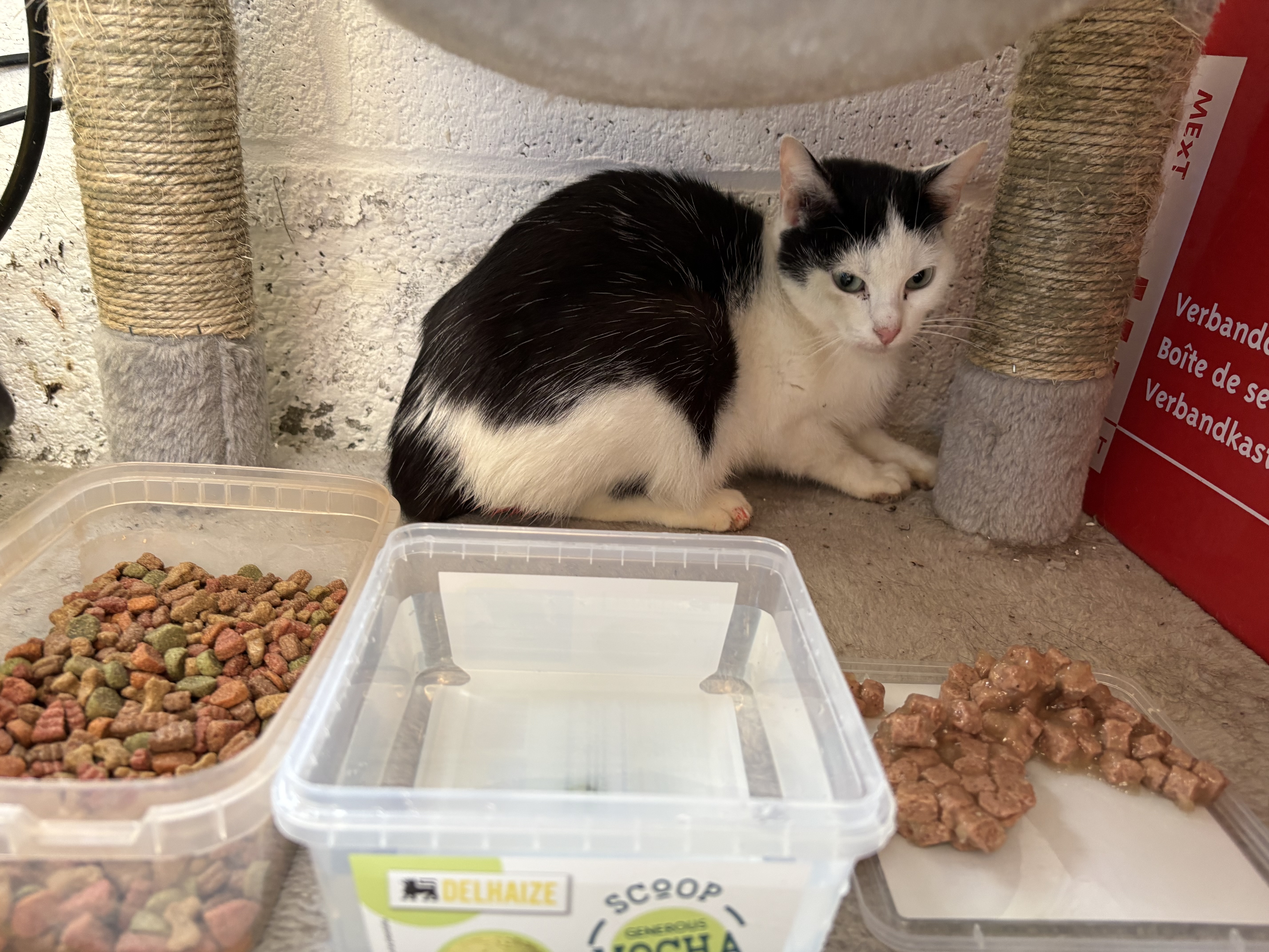 - Commentaire : Femelle trouvée au milieu des champs , perdue, affamée avec 2 chatons morts nés. Tous étaient caché sous les hautes herbes.